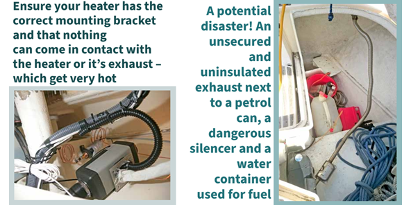 Unbelievably I’ve seen more than one spare gas canister and a few petrol cans stowed next to heaters! Flammable materials should never be stowed in cockpit lockers that have no direct overboard drainage. Use the proper, supplied mounting. The exhaust outlet should be fitted so that the hot gas won’t come in contact with fenders or dinghies. A correct exhaust outlet is insulated bracket to ensure proper air space around the heater and doesn’t fit it directly onto a wooden shelf.